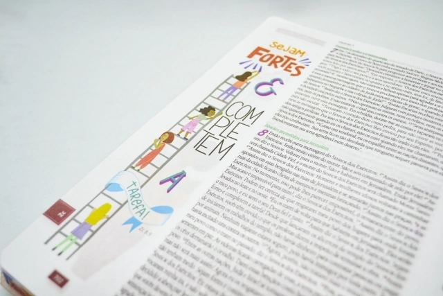 * Na parte final da Bíblia tem um caderno de registro com plano de leitura, espaço para anotações, desenhos para colorir, tutorial de como fazer desenhos e lettering.