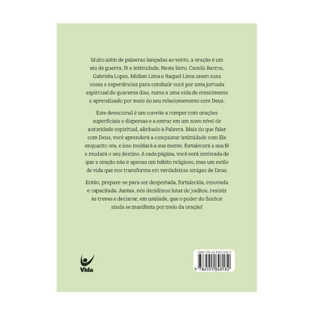 Muito além de palavras lançadas ao vento, a oração é um ato de guerra, fé e intimidade. Neste livro, Camila Barros, Gabriela Lopes, Midian Lima e Raquel Lima unem suas vozes e experiências para conduzir você por uma jornada espiritual de quarenta dias, rumo a uma vida de crescimento e aprendizado por meio do seu relacionamento com Deus.